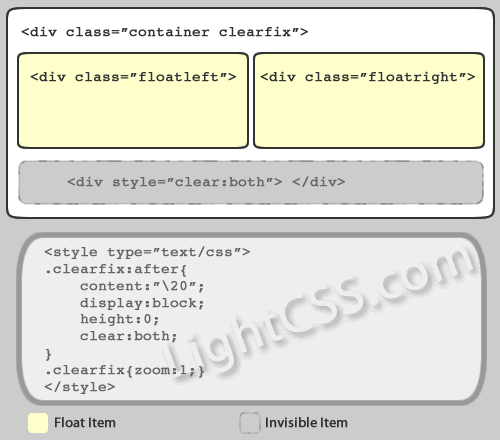 需要注意的是IE6,IE7不支持after伪元素,因此要添加.clearfix{zoom:1};来触发haslayout,或者你可以把它写到IE6、7的CSS hacker文件里,这样不会影响W3C标准验证