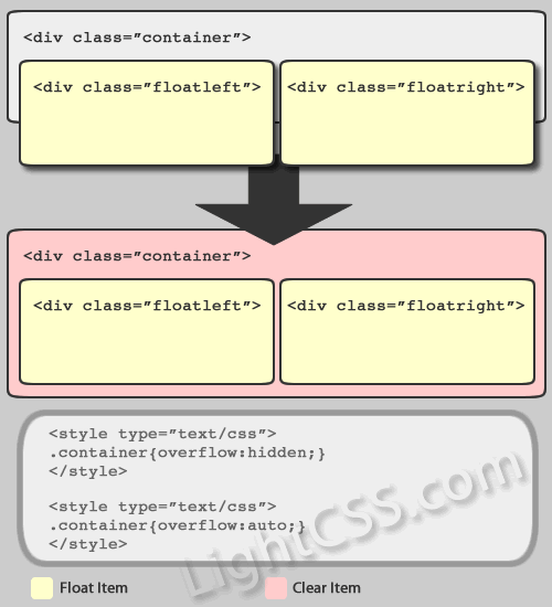 这个办法很有意思啊,我们知道,在使用float之后,元素会调到容器上层,但是使用overflow:hidden;之后,浮动元素又回到了容器中,把容器高度撑起,达到了清理浮动的作用(详解见图)