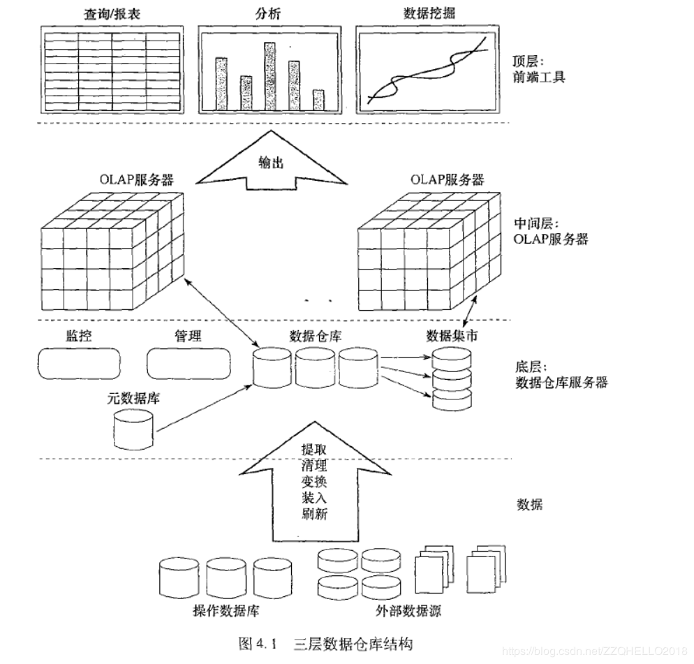 (1)底层:仓库数据库服务器(基本是一个关系型数据库)