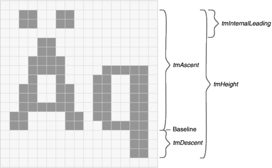 最重要的值是tmHeight,它是tmAscent和tmDescent的和。这两个值表示了基准在线下字符的最大纵向高度。「间距」(leading)指打印机在两行文字间插入的空间。在TEXTMETRIC结构中,内部的间距包括在tmAscent中(因此也在tmHeight中),并且它经常是重音符号出现的地方。tmInternalLeading字段可被设成0,在这种情况下,加重音的字母会稍稍缩短以便容纳重音符号。