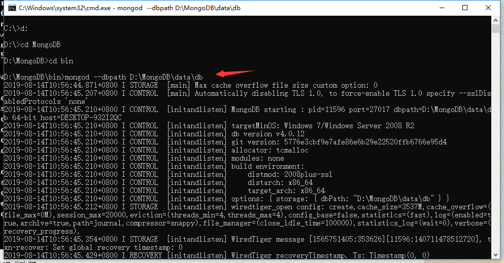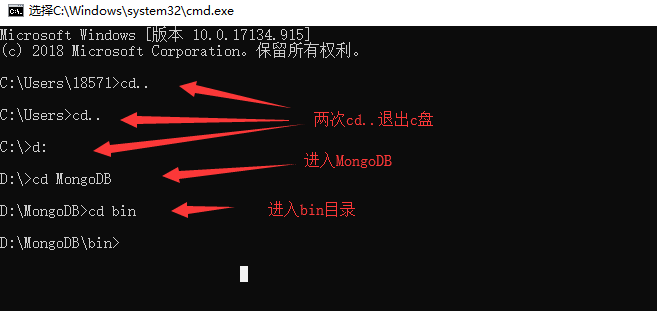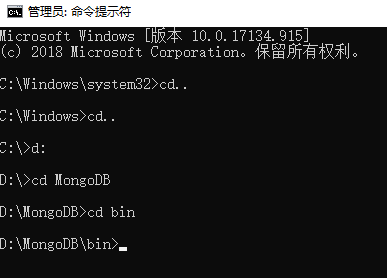 2.进入D盘,也就是你安装的目录,D:\MongoDB\bin;(一定要先进入D盘,让cd到你的目录 cd MongoDB, 然后在cd bin这个目录下)
