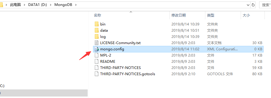 2.在mongodb新建配置文件mongo.config,这个是和bin目录同级的