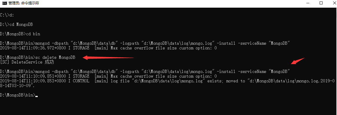 输入命令:sc delete MongoDB --这里的MongoDB是你以前安装的服务名称