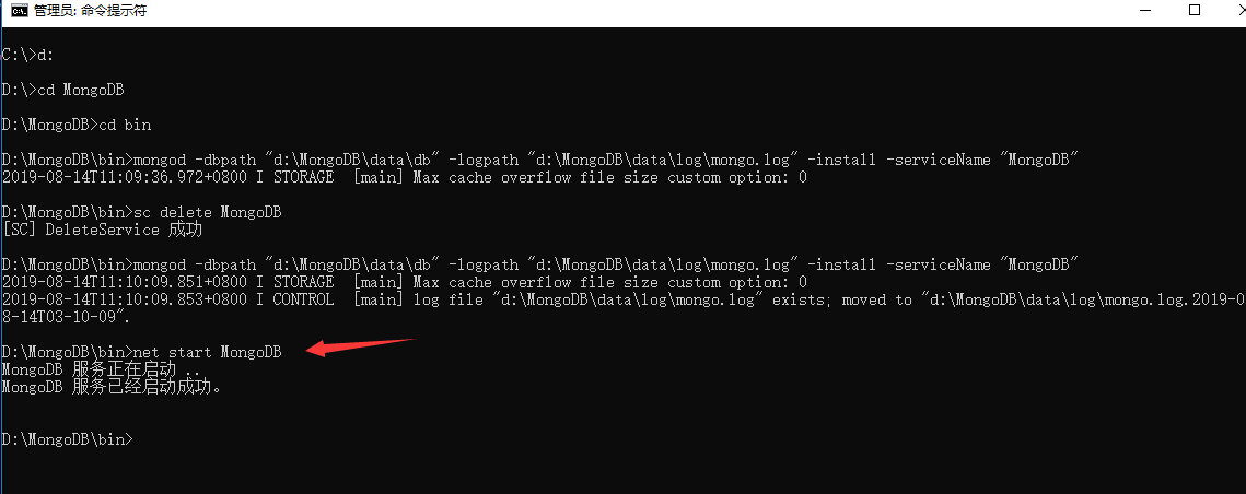 如果输入次命令出现错误的话,先删除服务sc delete MongoDB,再次输入上个命令就好了