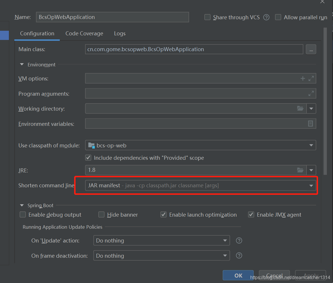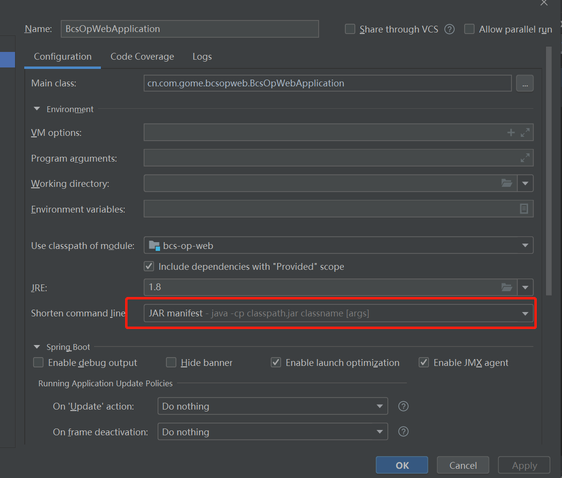 设置Springboot启动配置 shorten comand_line为jar mainfest
