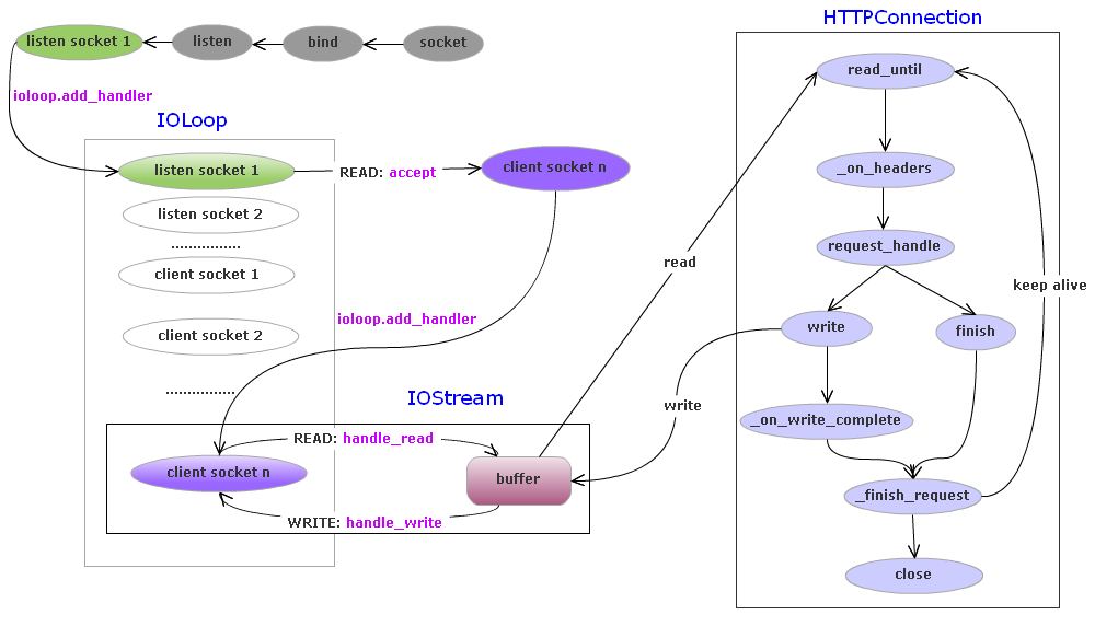 下面这幅图描述了tornado服务器的大体处理流程, 接下来我们将会详细分析每一步流程的实现