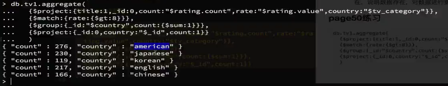 db.tv1.aggregate({$project:{_id:0,title:1,count:"$rating.count",rate:"$rating.value",country:'$tv_category'}},