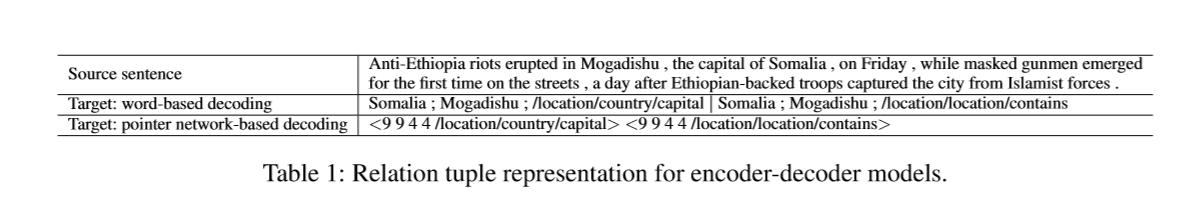 本文三个主要挑战:(i)该模型能够将实体和关系提取在一起。 (ii)能够提取具有重叠实体的多个元组。 (iii)能够准确地提取一个具有全名的元组实体。为了解决这些挑战,提出了两种使用编码器-解码器体系结构的新颖方法。首先提出一种用于关系元组的新表示方案(表1),以便它可以用简单的方式表示具有重叠实体和不同长度实体的多个元组。采用编码器-解码器模型,其中解码器像机器翻译模型一样一次提取一个单词。在序列生成的最后,由于元组的独特表示,可以从单词序列中提取元组。尽管此模型执行得很好,但是一次生成一个单词对于此任务来说有点不自然。每个元组恰好具有两个实体和一个关系,并且每个实体在句子中显示为连续的文本范围。识别它们的最有效方法是在句子中找到它们的开始和结束位置。然后,使用五个元素来表示每个关系元组:两个实体的开始和结束位置以及它们之间的关系(请参见表1)。考虑到这一点,提出了一个基于指针网络的解码框架。该解码器由两个指针网络和一个识别它们之间关系的分类网络组成,该指针网络可以找到句子中两个实体的开始和结束位置。在解码的每个时间步,此解码器都提取整个关系元组,而不仅仅是单词。