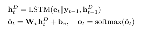 是第i个标记的嵌入向量,m是目标序列的长度。 y0和ym分别代表SOS和EOS标记的嵌入向量。解码器一次生成一个标记,并在生成EOS时停止。使用LSTM作为解码器,在时间步t,解码器将源语句编码(