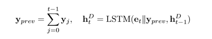 作为输入,并生成当前元组的隐藏表示。句子编码向量集使用注意力机制获得。关系元组是一个集合,为了防止解码器再次生成相同的元组,在解码的每个时间步传递有关所有先前生成的元组的信息。yj是在时间步长j <t预测的元组的向量表示,使用零向量(