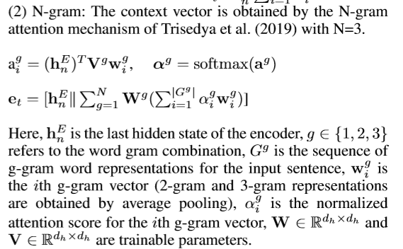 ,其中dw是单词向量的维数,A是输入句子标记的字符字母,而dc是字符嵌入向量的维数。使用具有最大池化的卷积神经网络为每个单词提取维度为df的特征向量。串联词嵌入和基于字符嵌入的特征向量以获得输入标记的表示形式。源语句S由其标记x1; x2; ::::; xn的向量表示,其中