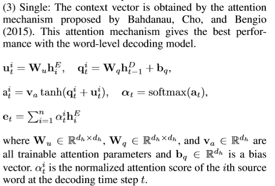 针对词级解码模型使用三种不同的注意力机制,以获得源上下文向量