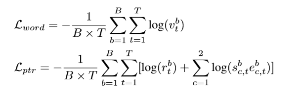 表示第i个源字词是预测元组第一个实体的开始和结束标记的标准化概率。然后使用另一个的指针网络提取元组的第二个实体,将隐向量