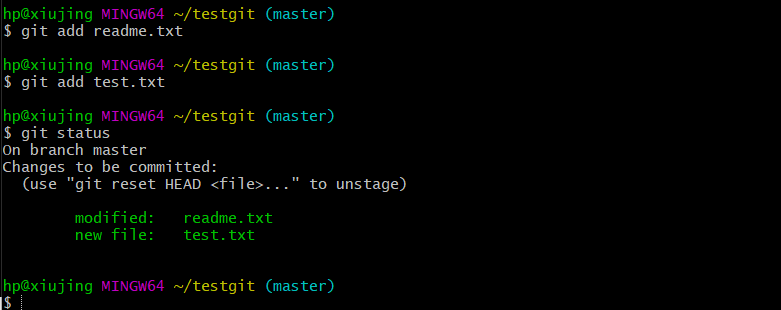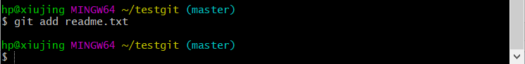 第一步:使用命令 git add readme.txt添加到暂存区里面去。如下: