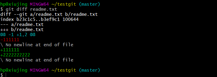 如上可以看到,readme.txt文件内容从一行11111111改成 二行 添加了一行22222222内容。