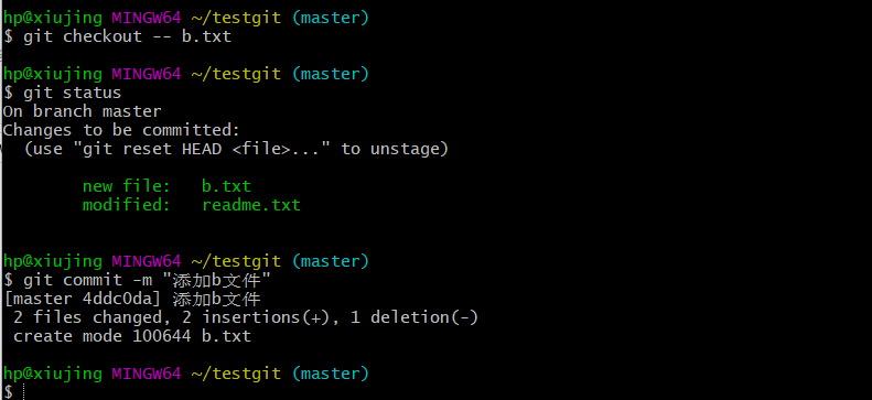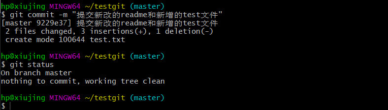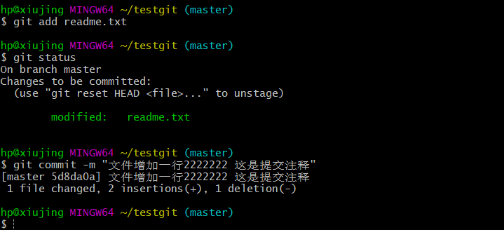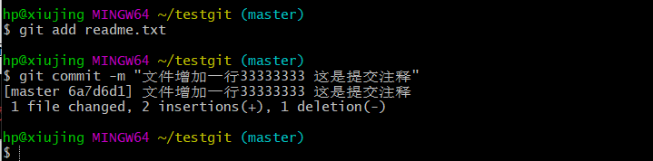 知道了对readme.txt文件做了什么修改后,我们可以放心的提交到仓库了,提交修改和提交文件是一样的2步(第一步是git add 第二步是:git commit)。