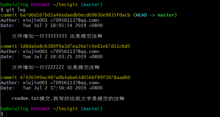 现在我已经对readme.txt文件做了三次修改了,那么我现在想查看下历史记录,如何查呢?我们现在可以使用命令 git log 演示如下所示: