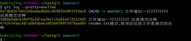 git log命令显示从最近到最远的显示日志,我们可以看到最近三次提交,最近的一次是,增加内容为333333.上一次是添加内容222222,第一次默认是 111111.如果嫌上面显示的信息太多的话,我们可以使用命令 git log –pretty=oneline 演示如下: