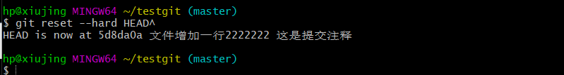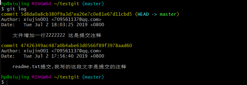 可以看到,内容已经回退到上一个版本了。我们可以继续使用git log 来查看下历史记录信息,如下: