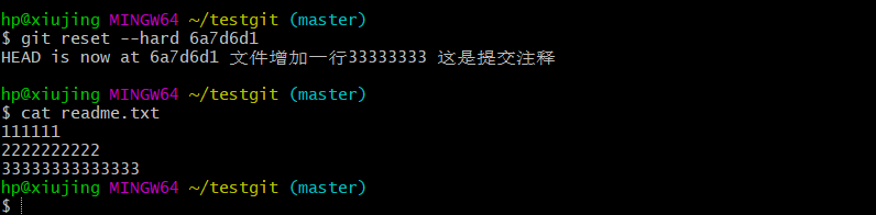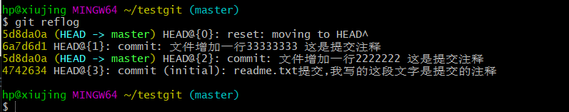 git reset --hard 版本号 ,但是现在的问题假如我已经关掉过一次命令行或者333内容的版本号我并不知道呢?要如何知道增加3333内容的版本号呢?可以通过如下命令即可获取到版本号:git reflog 演示如下: