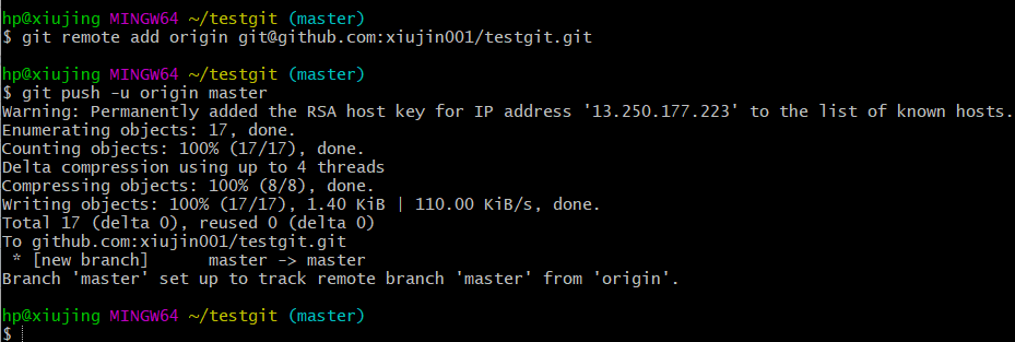 git push –u(第一次要用-u 以后不需要) origin master 把当前master分支推送到远程库