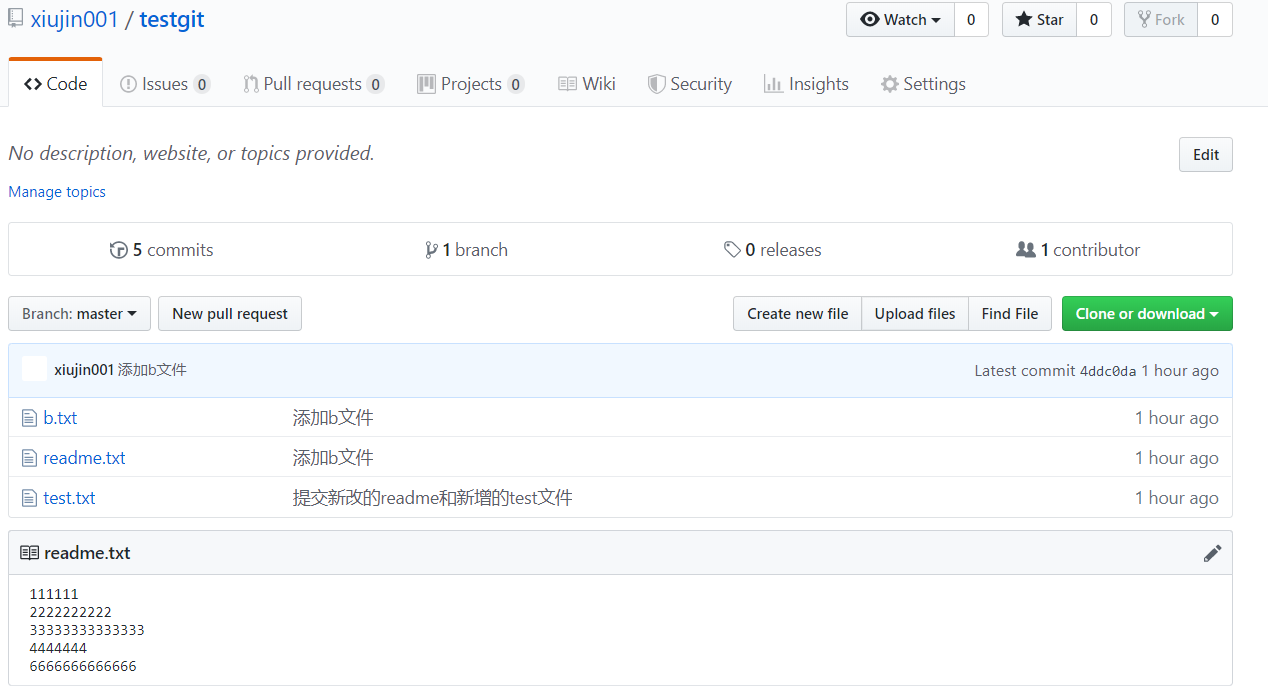 我们可以看到如上,推送成功,我们可以继续来截图github上的readme.txt内容 如下: