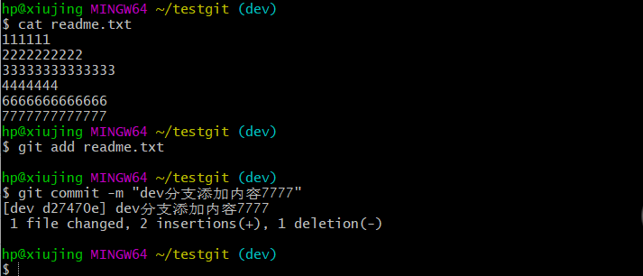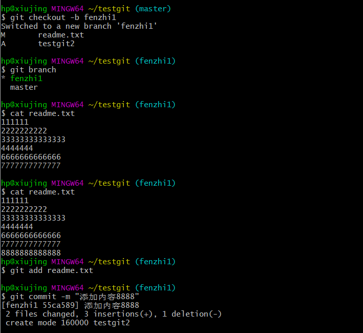 下面我们还是一步一步来,先新建一个新分支,比如名字叫fenzhi1,在readme.txt添加一行内容8888888,然后提交,如下所示: