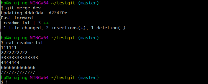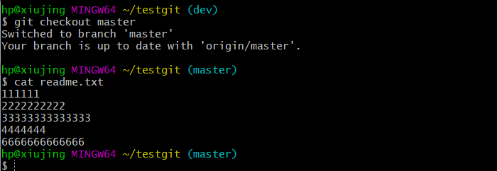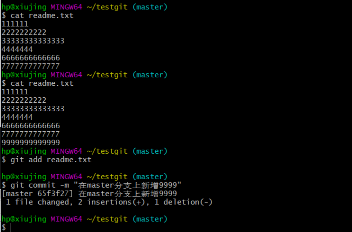 同样,我们现在切换到master分支上来,也在最后一行添加内容,内容为99999999,如下所示: