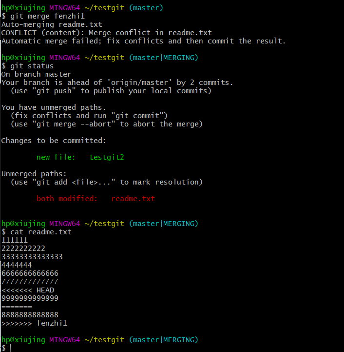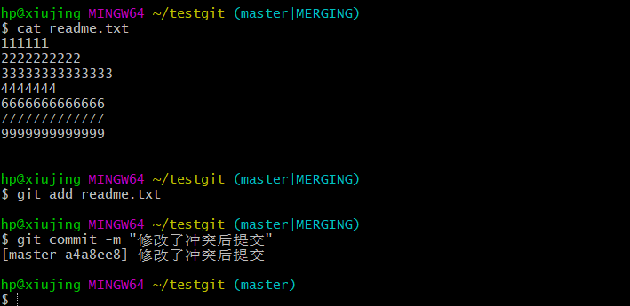 现在手动已经解决完了,我接在需要再提交,再push到远程库里面去。如下所示: