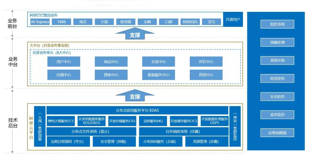 首先是中台的率先落地实践。传统企业的烟囱式架构,导致企业信息化存在重复建设、重复投资、高昂的交互和协作成本等问题。当这些互联网巨头们成长为业务极为多元、沟通逻辑十分复杂的庞大组织时,传统平台俨然已无法跟上发展的脚步。因此,他们对中台的迫切需求就首先需要在业务上去实现。通过构建有效的中台能力,并开放给客户,为各个领域的企业和开发者搭建数字化的业务平台,从而提升整个产业的竞争力。