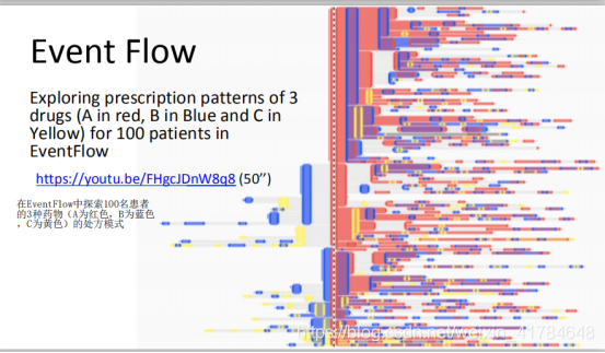 每根线表示一个诊疗方案,事件通过圆形的点来表示,同时将诊疗方案切割成了若干个阶段,然后可以看到在每个阶段发生的信息。