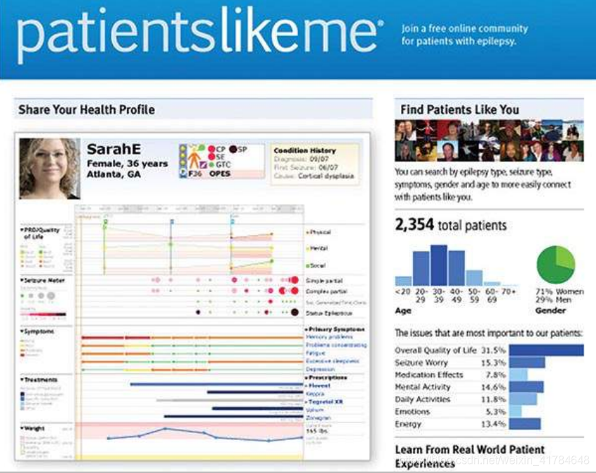 对于用的个体信息展现一般都是给用户看的,这样的可视化图形要求简单明了和易懂。Patientslikeme 网站可以分享自己个人的生病信息数据,然后网站可以在信息库里用图表示和你有相同症状的病人信息及过程。