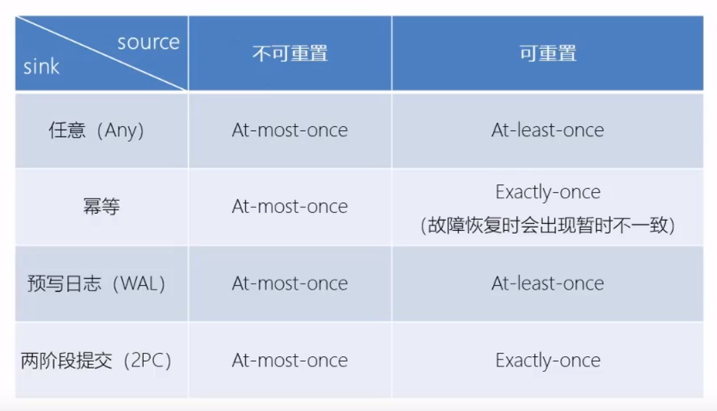 (3)sink端(从故障恢复时数据不会重复写入外部系统,比如幂等写入,事务写入)