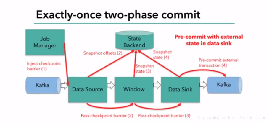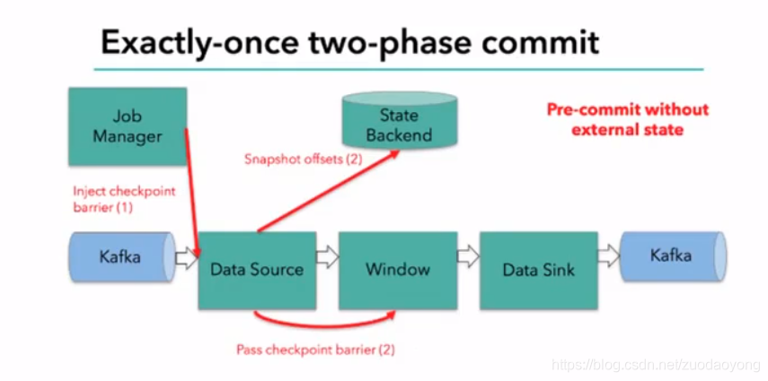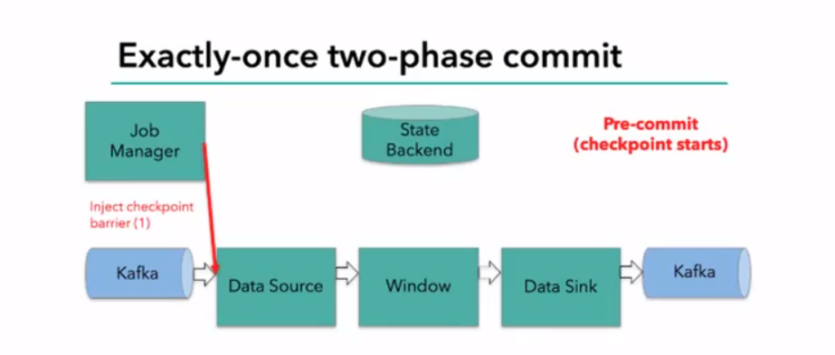 注意:sink任务首先把数据写入外部kafka,这些数据都属于预提交的事务里的,遇到barrier时把状态保存到状态后端,并开启新的预提交事务