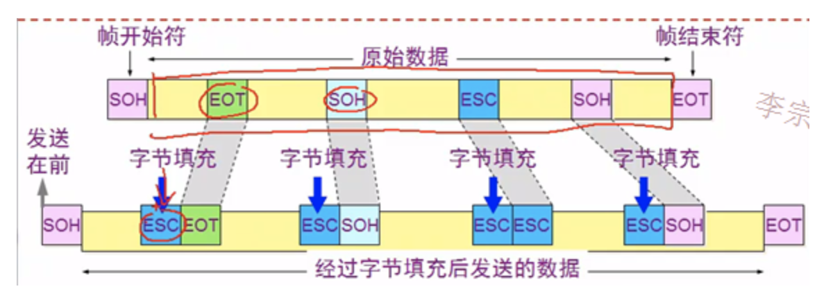 字节填充的首尾界符法:若传输的数据是可打印的ASCII值(95位)时一切正常;如果除了可打印的ASCII值之外还有其他的字符则用如图方式进行填充(soh为十六进制的01,eot为十六进制的04,eot为十六进制的1b)