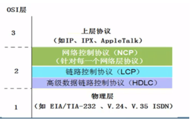 网络控制协议(NCP)针对每一个网络层协议 链路控制协议(LCP)身份验证,计费功能 高级数据链路控制协议(HDLC)