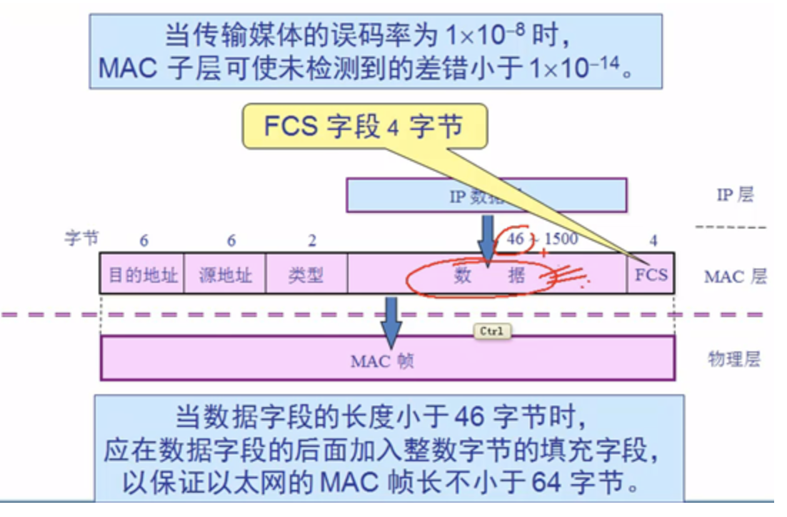 无效帧:帧的长度不是整数个字节 ;用收到的帧检验序列FCS查出有差错;有效的MAC帧长度在64~1518字节之间