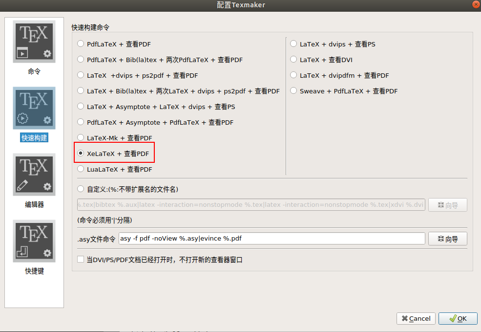 在linux系统中,重要的是首先要将构建命令改为XeLaTex,这样在编译的时候就不会报错了,如下图。