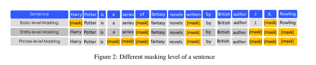 我们使用先验知识来增强我们的预训练语言模型。 我们提出了一种多阶段的知识掩盖策略,而不是直接添加知识嵌入,而是将短语和实体级知识集成到语言表示中。 句子的不同掩蔽级别在图2中进行了描述。