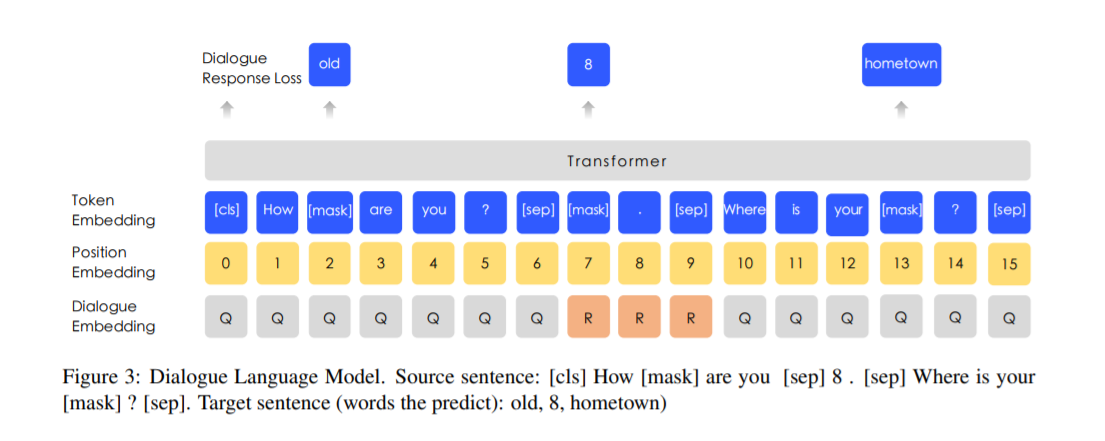 对话数据对于语义表示很重要,因为相同答复的相应查询语义通常很相似。 ERNIE在DLM(对话语言模型)任务上对查询-响应对话结构进行建模。如图3所示,我们的方法引入了对话嵌入(dialogue embedding)来识别对话中的角色,这与通用句子编码器的方法不同(Cer等人,2018)。 ERNIE的“对话”嵌入功能与BERT中的令牌类型嵌入功能相同,不同之处在于ERNIE还可以表示多回合对话(例如QRQ,QRR,QQR,其中Q和R分别代表“查询”和“响应”)。像BERT中的MLM一样,使用掩码来强制使模型预测以查询和响应为条件的缺失词。而且,我们通过用随机选择的句子替换查询或响应来生成假样本。该模型旨在判断多回合对话是真实的还是假的。