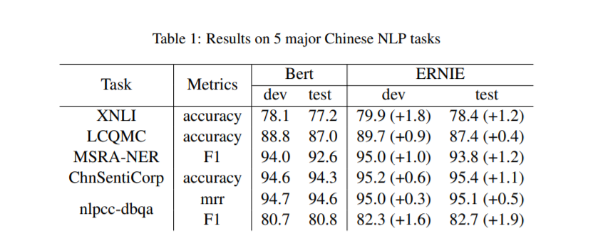 ERNIE被应用于5个中文NLP任务,包括自然语言推理,语义相似性,命名实体识别,情感分析和问答对。