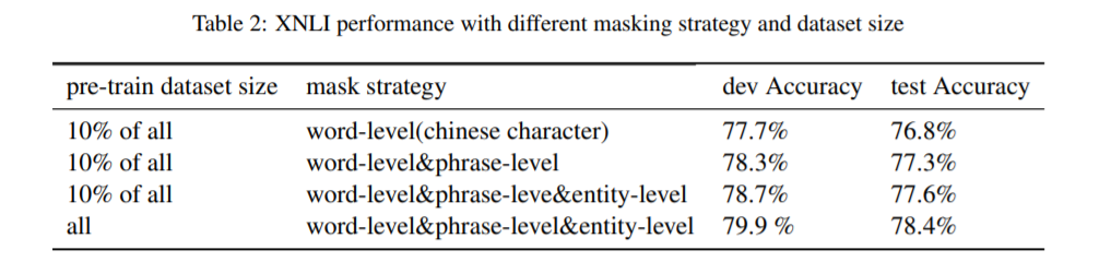 我们从整个语料库中抽取10%的训练数据,以验证知识掩盖策略的有效性。 结果显示在表2中。我们可以看到,将短语级掩码添加到基线单词级掩码可以改善模型的性能。 在此基础上,我们添加了实体级屏蔽策略,从而进一步提高了模型的性能。 此外。 结果还显示,使用预训练数据集的大小大10倍,XNLI测试集可实现0.8%的性能提升。