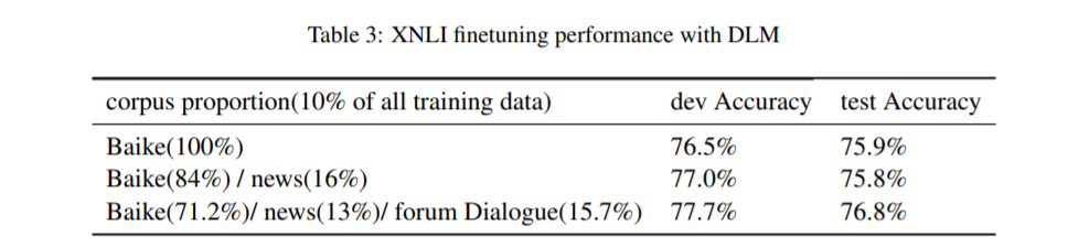 我们也对DLM任务进行了消融研究。 我们使用不同比例的所有训练语料库的10%来说明DLM任务对XNLI开发集的贡献。 我们对这些数据集从头开始对ERNIE进行了预训练,并从5次随机重新启动微调中报告了XNLI任务的平均结果。 表3给出了详细的实验设置和开发设置结果,我们可以看到,在此DLM任务中,开发/测试精度提高了0.7%/ 1.0%。