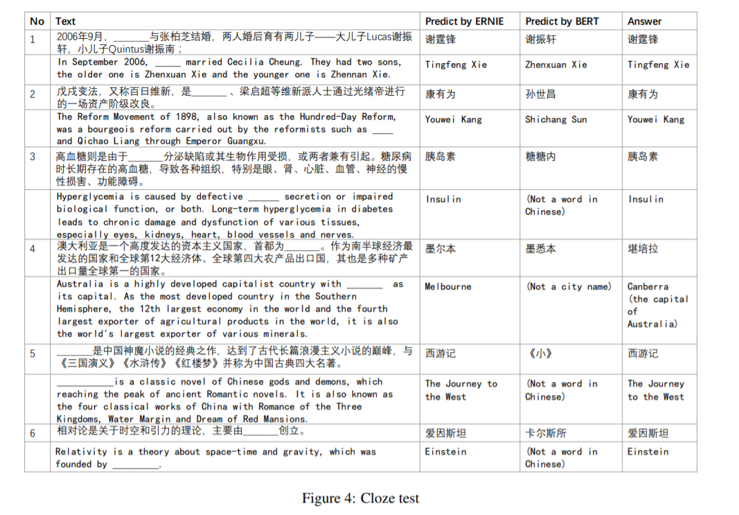 在情况1中,BERT尝试复制出现在上下文中的名称,而ERNIE则记住了文章中提到的有关关系的知识。