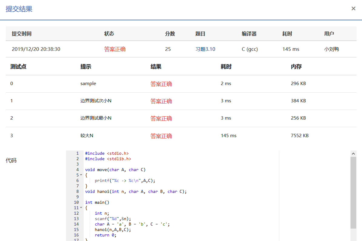 每个操作(移动)占一行,按柱1 -> 柱2的格式输出。