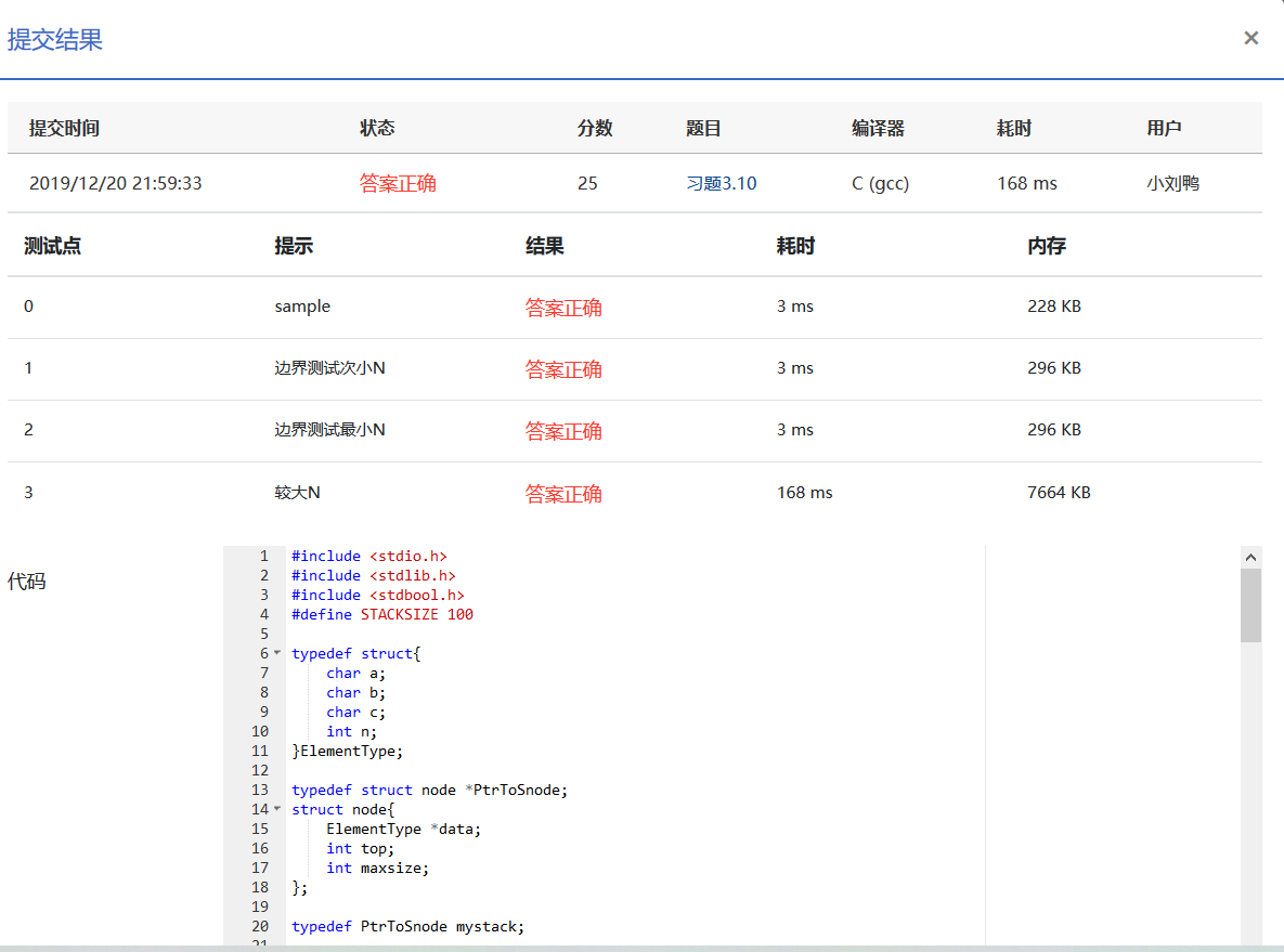 这里用到了结构体,堆栈以及结构数组,这里有一个点容易遗忘,当用malloc为指针类型变量申请空间的时候,格式是(ElementType *)malloc(n * sizeof(ElementType));这里的ElementType是你申请的变量的名称,本题这里是一个结构体数组,所以申请的是一个指向结构体的指针的空间,data数组存储的是一堆指针,其余的都是小操作,花了很多时间这道题,做了两次以后还得好好温习!!!