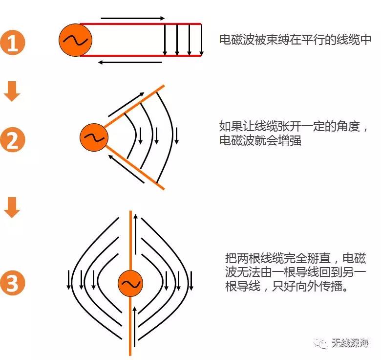 那么,天线是怎样把这些电磁波发送出去的呢?看完下图就明白了。
