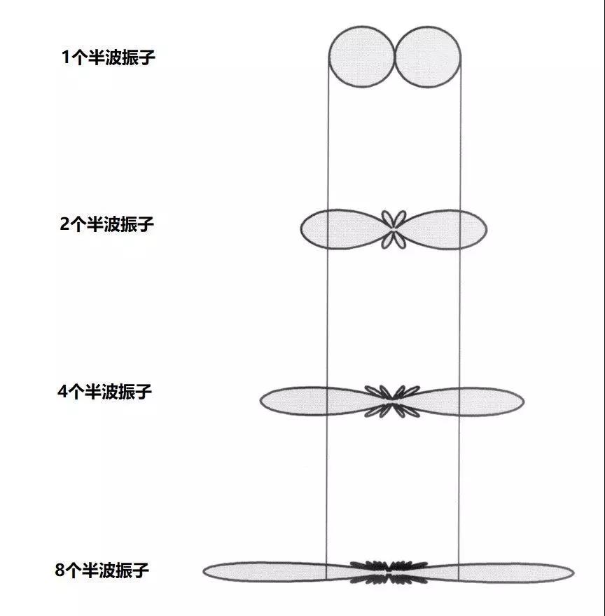 那么怎样拍扁呢?答案就是增加半波振子的数量。多个振子的发射在中心汇聚起来,边缘的能量得到了削弱,就实现了拍扁辐射方向,集中水平方向能量的目的。