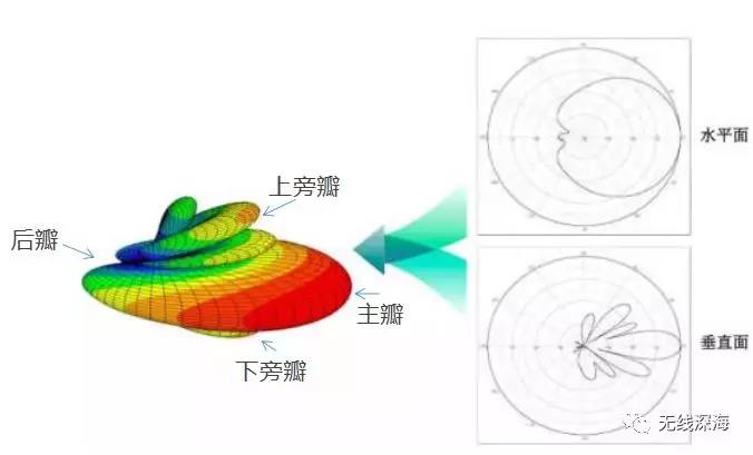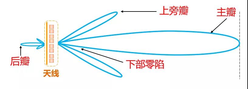 水平方的主瓣向发射地远远地,但垂直方向产生了上旁瓣和下旁瓣,同时由于反射不完全,后面还有个尾巴,称为后瓣。