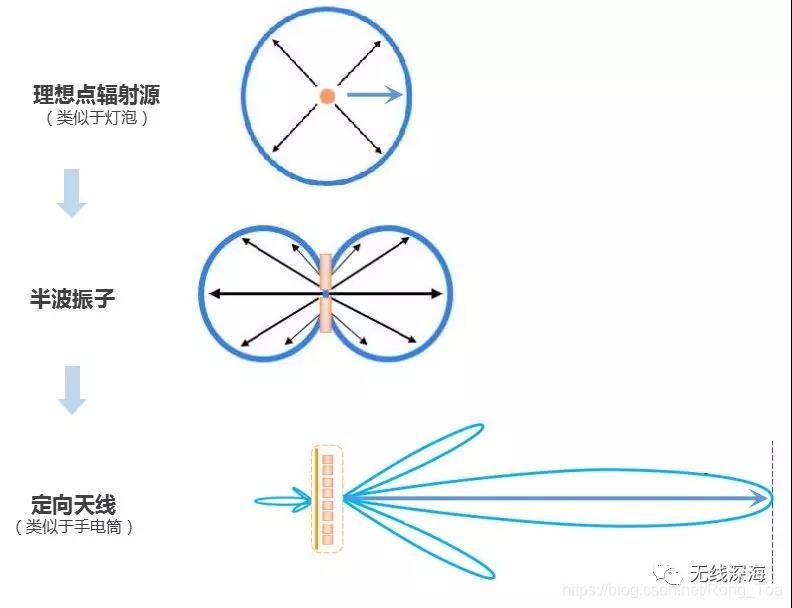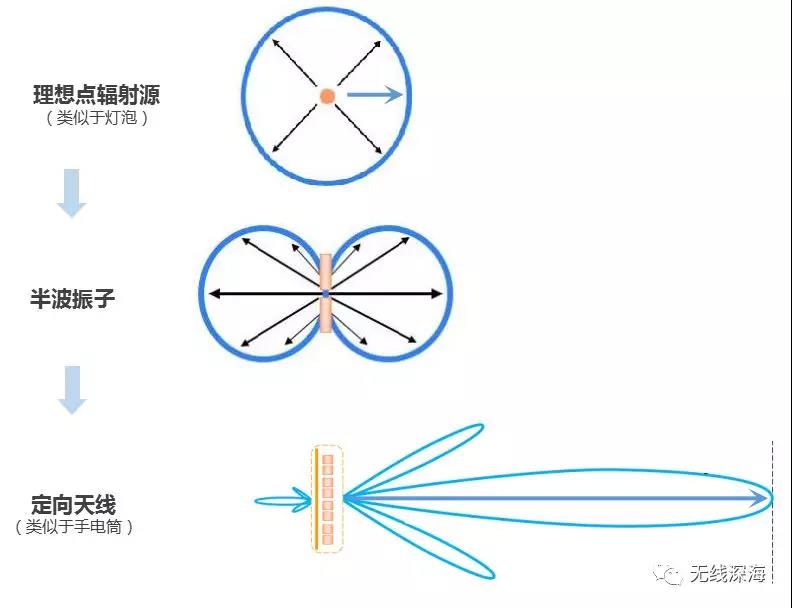 如下图所示,相对于理想的点辐射源和半波振子,天线在可以把能量聚集在主瓣方向,能把电磁波发送地更远,相当于在主瓣方向上增强了。也就是说,所谓增益是在某个方向上相对于点辐射源或者半波振子来说的。